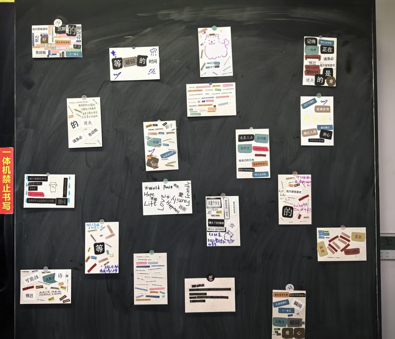 活动以拼贴诗创作为核心形式,现场为学生准备了书籍摘录、杂志片段、诗词短句等多元文字素材。大家手持剪刀与胶水,根据自身心境剪裁拼贴,将碎片化的文字重新组合,融入个人生活感悟与未来期许。创作完成后,不少学生主动起身分享作品灵感,有的同学借拼贴诗抒发了学业压力下的释然,有的则表达了对生活美好的向往,真挚的分享让现场氛围温馨又治愈,也让拼贴诗成为了情绪宣泄、自我觉察与心灵疗愈的独特载体。此次活动是学院心理育人体系建设的重要环节,通过创意创作的形式,让心理健康教育变得生动有趣。