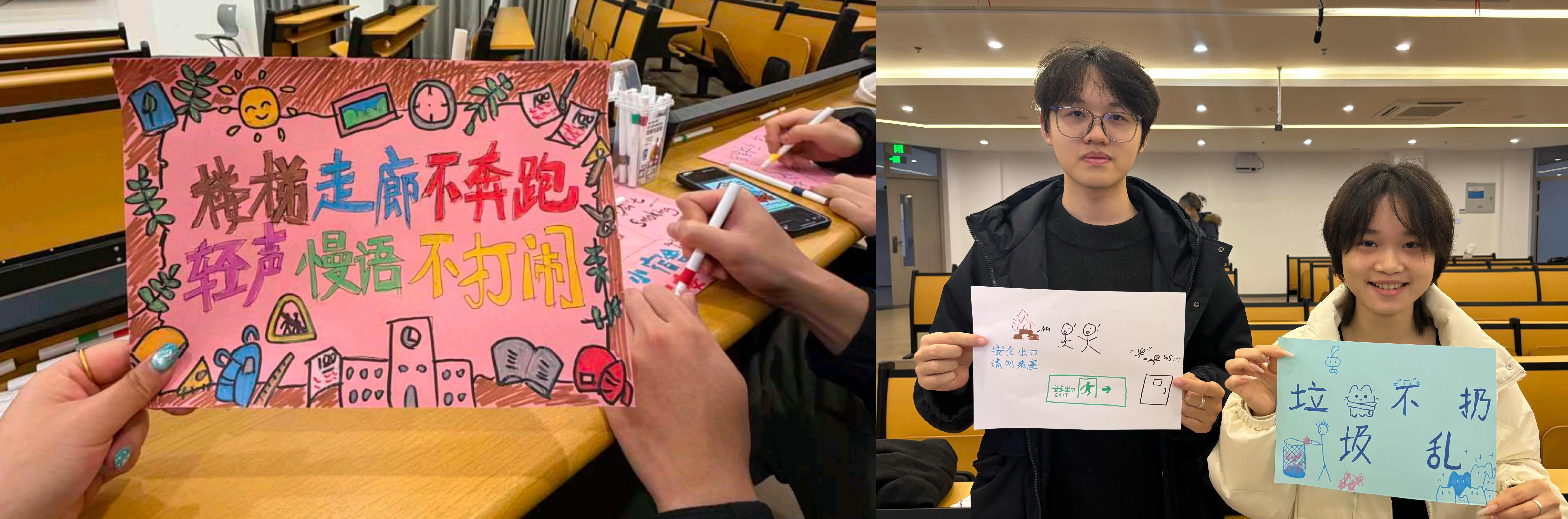 在“宿舍标语设计大赛”中,同学们充分发挥创意与巧思,以笔绘心,创作出众多或温馨励志、或活泼幽默的标语作品。通过活动现场展示与交流分享,这些充满巧思的创作激发了大家对文明宿舍、和谐社区的深入思考与情感共鸣。活动以创意表达为载体,在交流互动中潜移默化地凝聚了共识,增强了学生对社区的归属感与文化认同。