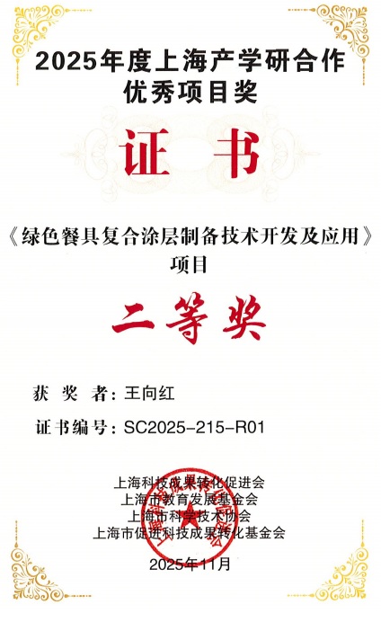 12月26日,2025年度“上海产学研合作优秀项目奖”表彰大会在市政协举行。由我校联合浙江万得福智能科技股份有限公司(以下简称“万得福公司”)共同完成的“绿色餐具复合涂层制备技术开发及应用”项目,荣获2025年度上海产学研合作优秀项目奖二等奖,项目负责人王向红教授代表团队出席颁奖活动。