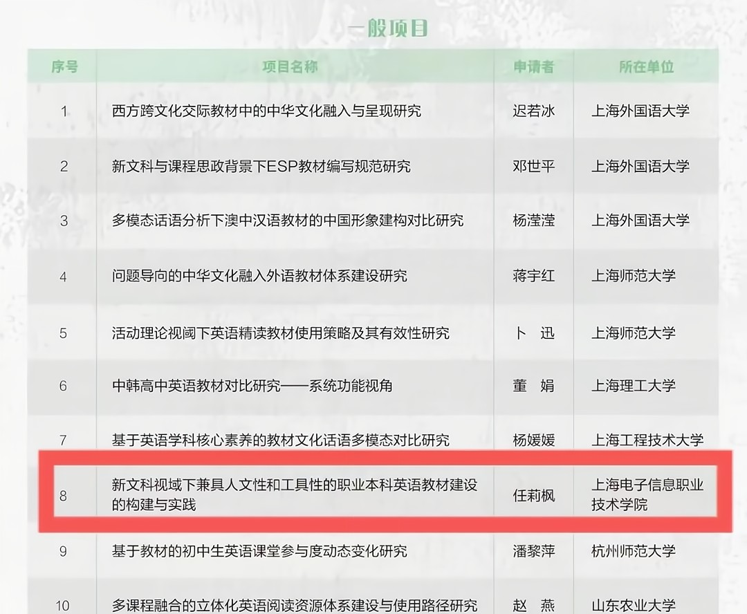 近日,上海外国语大学外语教材研究院“2022年外语教材研究项目”评审结果公布,我校外语学院任莉枫教授主持的课题“新文科视域下兼具人文性和工具性的职业本科英语教材的构建与实践”获批立项。该项目共收到网上...