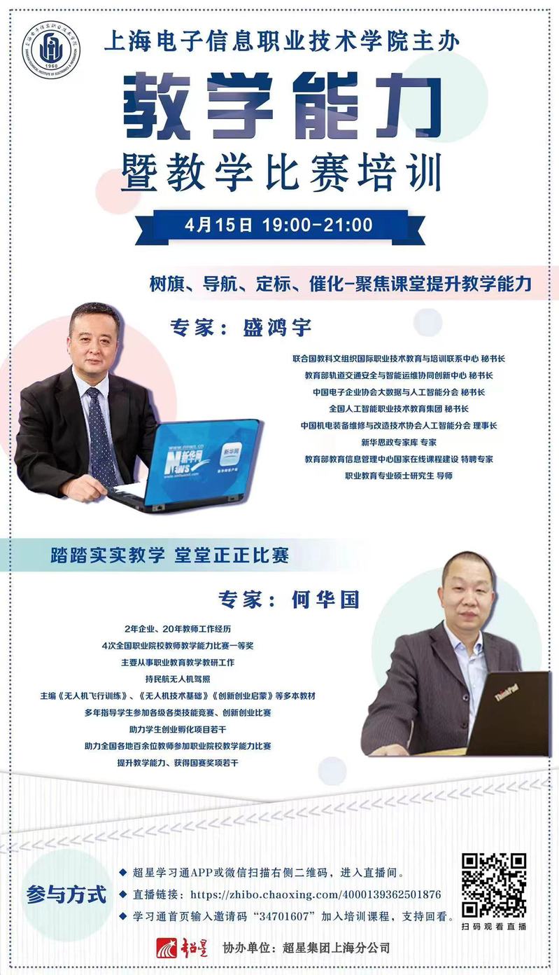4月15日晚,我校成功举办全国教学能力暨教学比赛培训会。培训活动邀请到联合国教科文组织国际职业技术教育与培训联系中心秘书长、教育部轨道交通安全与智能运维协同创新中心秘书长、中国电子企业协会大数据与人...