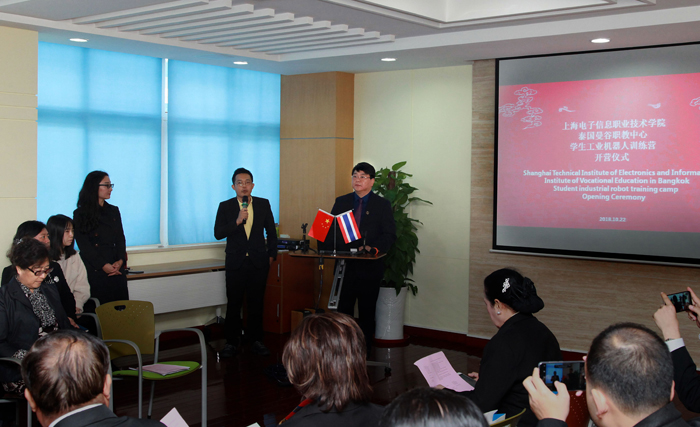 2018年10月22日,上海电子信息职业技术学院与泰国曼谷职教中心合作的学生工业机器人训练营开营。曼谷职业教育中心主任冲普努•波邦松、副主任优玛蓬•柴佘仁、高级职员赛丰•菲塔克、师生团领队林宏瑛,上海电子信...