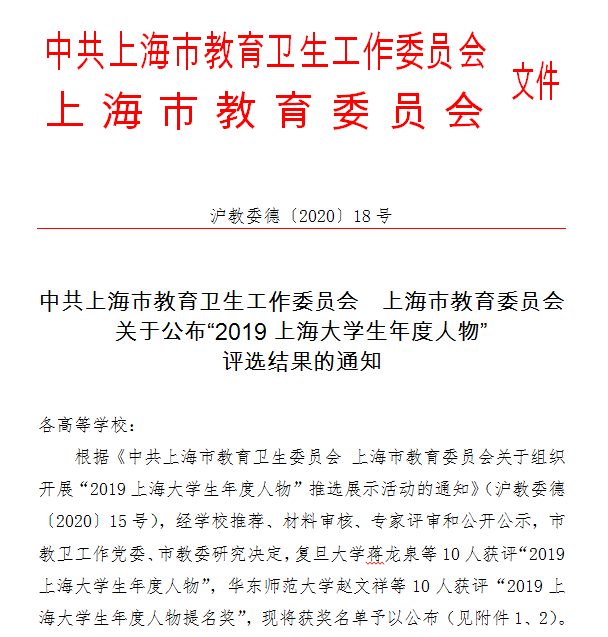 近日,中共上海市教育卫生工作委员会、上海市教育委员会联合发布了“2019上海大学生年度人物”名单(沪教委德〔2020〕18号)。经学校推荐、材料审核、专家评审和公示,我校通信与信息工程学院陈光耀同学等10人...