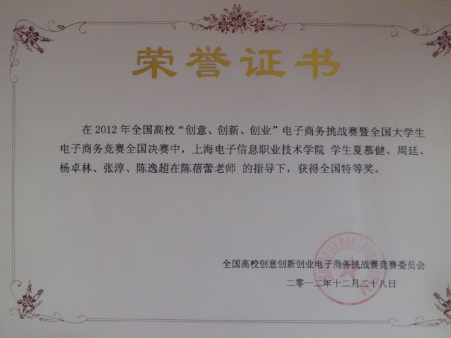 我院学生在全国高校“创意、创新、创业”电子商务挑战赛暨全国大学生电子商务竞赛中荣获全国特等奖