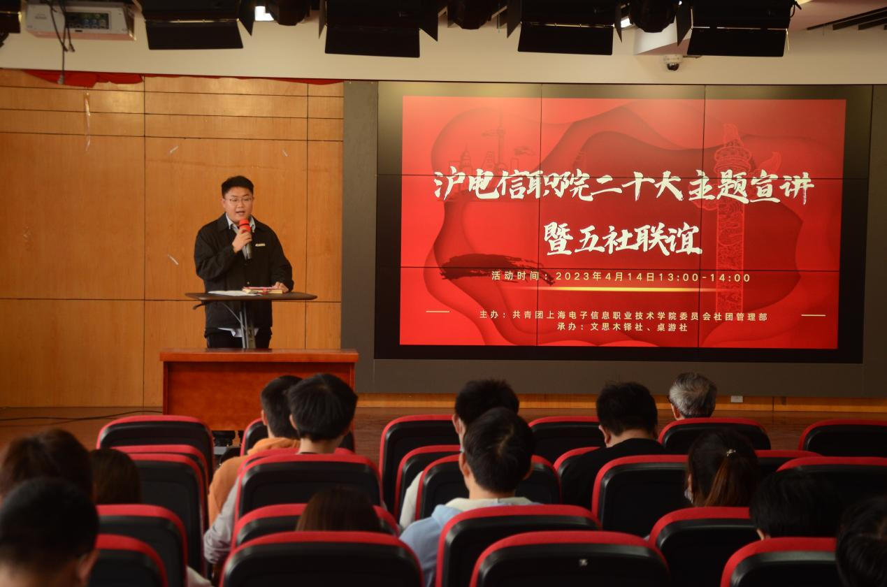 “珍惜韶华,奋发有为”,为深入学习宣传贯彻党的二十大精神,加强学生社团思想政治教育,4月14日,上海电子信息职业技术学院文思木铎社、桌游社邀请日新思辨社、翰轩棋社、静态模型社成员及我校38个学生社团骨干近2...