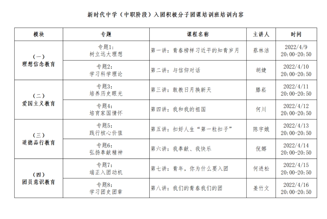关于举办新时代中学(中职阶段)入团积极分子 团课培训班的通知