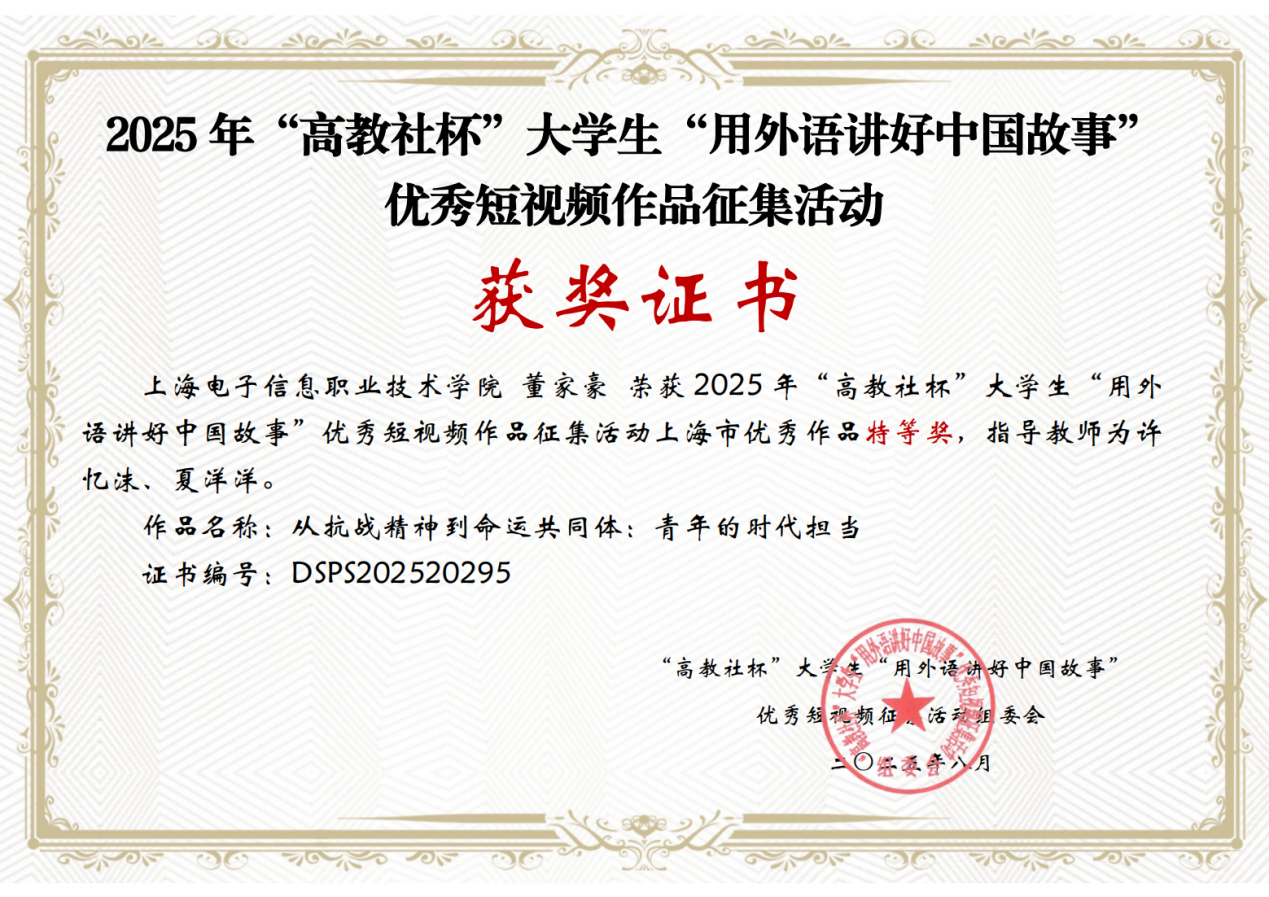 近日,2025年“高教社杯”大学生用外语讲好中国故事短视频大赛全国总决赛圆满落幕。外语学院许忆沫、夏洋洋两位老师指导的学生董家豪,凭借作品《从抗战精神到命运共同体:青年的时代担当》,在众多参赛者中表现优异...