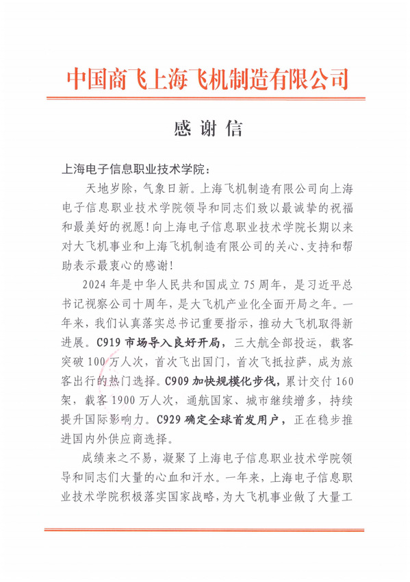 近日,学校收到中国商飞上海飞机制造有限公司发来的感谢信,感谢我校在产教融合、校企双元育人工作中作出的积极贡献。来信指出,2024年,中国商飞上海飞机制造有限公司在推动大飞机事业方面取得了新进展,C919市...