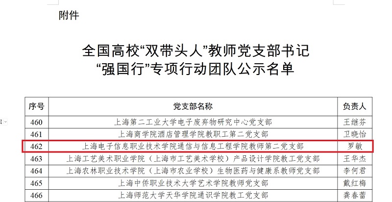 近日,教育部思想政治工作司公布了全国高校“双带头人”教师党支部书记“强国行”专项行动公示名单,我校通信与信息工程学院教师第二党支部成功入选。此项目是通信学院教师第二党支部获得“全国党建工作样板支部”培...