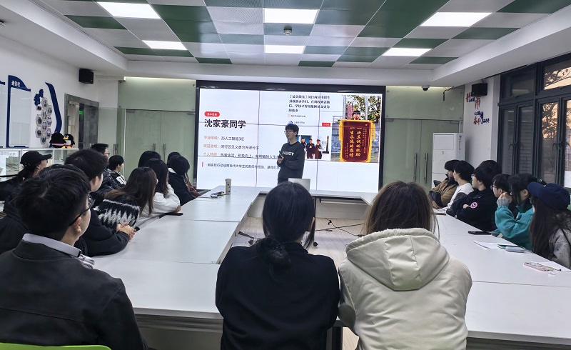 11月26日,通信学院易班工作站以“身边的榜样”为主题,邀请2025级人工智能技术应用3班学生沈家豪在J112教室分享其见义勇为事迹。近40名师生参与分享会。沈家豪同学的见义勇为事迹曾被“学习强国”学习平台报道,曾...
