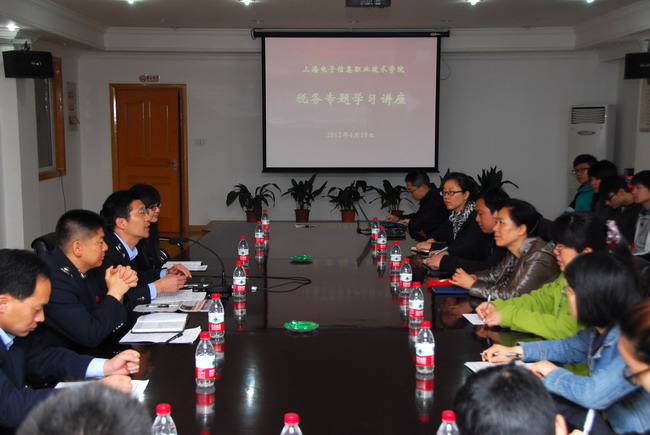 4月19日上午,“税法宣传进校园”主题活动在我院举行。奉贤区税务局第11税务所所长沈建国、副所长秦春宝一行来我院为师生做税法专题讲座,受到师生的热烈欢迎。 沈建国所长介绍,4月份是我国第21个国家税...