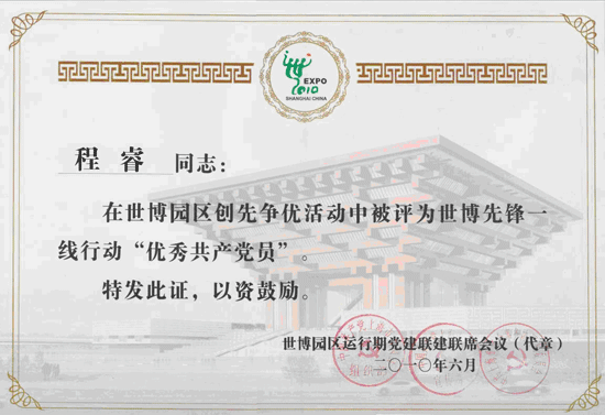 我院程睿老师被评为世博先锋一线行动“优秀共产党员”